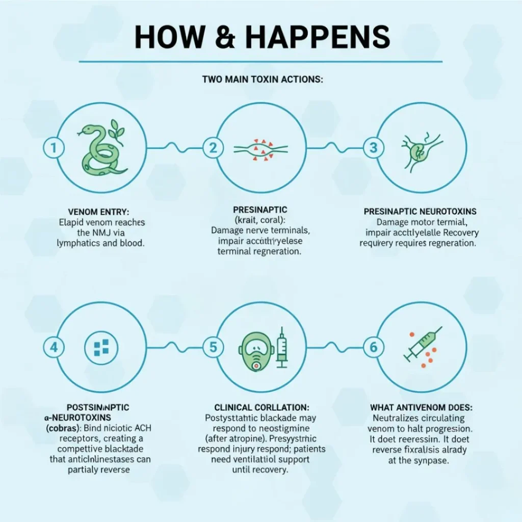 Snakebite envenomation is a significant yet often overlooked medical emergency worldwide. Among the diverse spectrum of venomous snakes, neurotoxic species such as cobras, kraits, coral snakes, and mambas possess toxins that specifically target the neuromuscular junction, resulting in progressive muscle paralysis. This paralysis can swiftly affect respiratory muscles, leading to respiratory failure and, if untreated, death. Understanding Neuroparalytic Snake Bite is crucial for MBBS students preparing for examinations, emergency doctors making split-second decisions, allied health professionals managing supportive care, and laypersons seeking to recognize early warning signs.