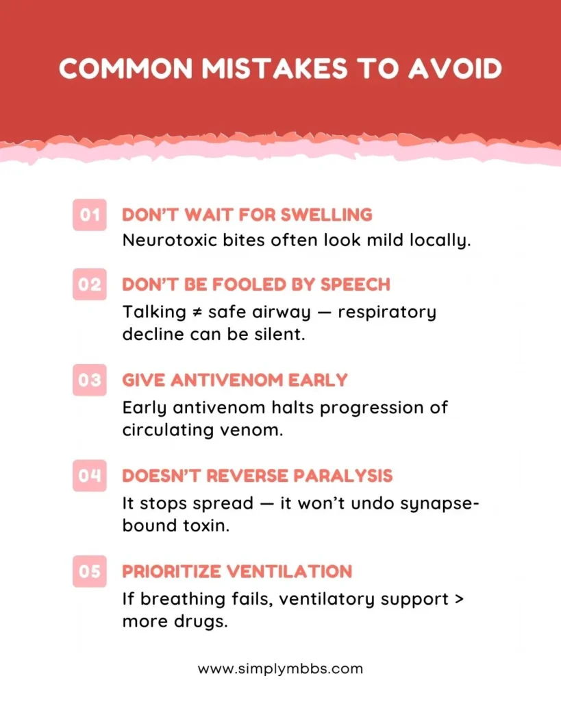 - Definitive Treatment: Species-specific or polyvalent antivenom combined with ventilatory support.